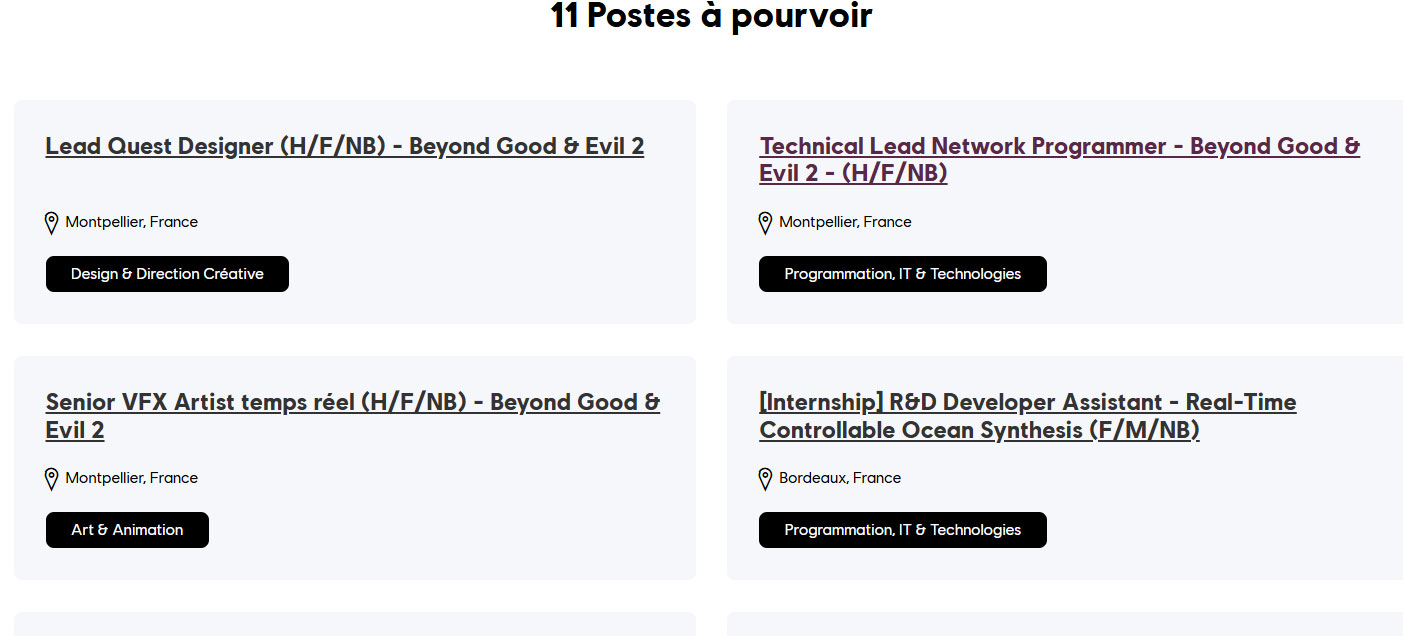 Sur le site carrière d’Ubisoft, plusieurs postes liés directement à Beyond Good and Evil 2 viennent d’apparaître, une première depuis longtemps. On y trouve notamment :