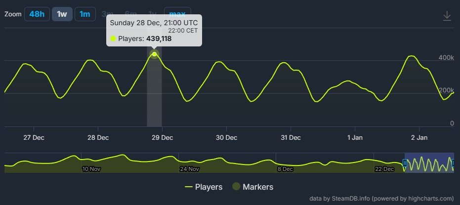 En effet, ARC Raiders affichait pas moins de 439 118 joueurs en simultanés d’après les données enregistrées par SteamDB, ce qui est assez proche de son record de novembre.