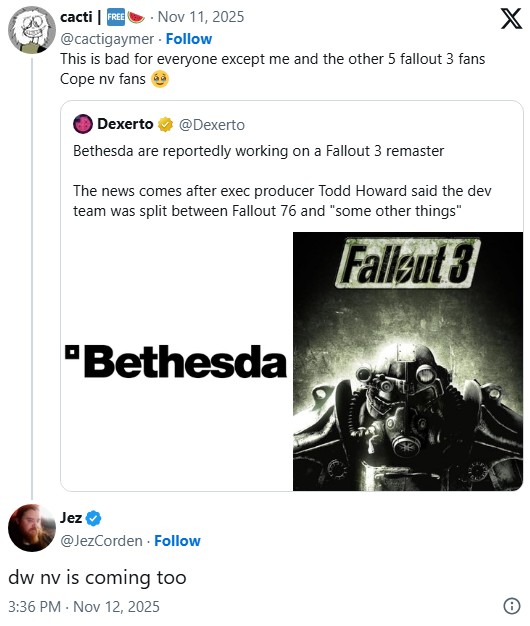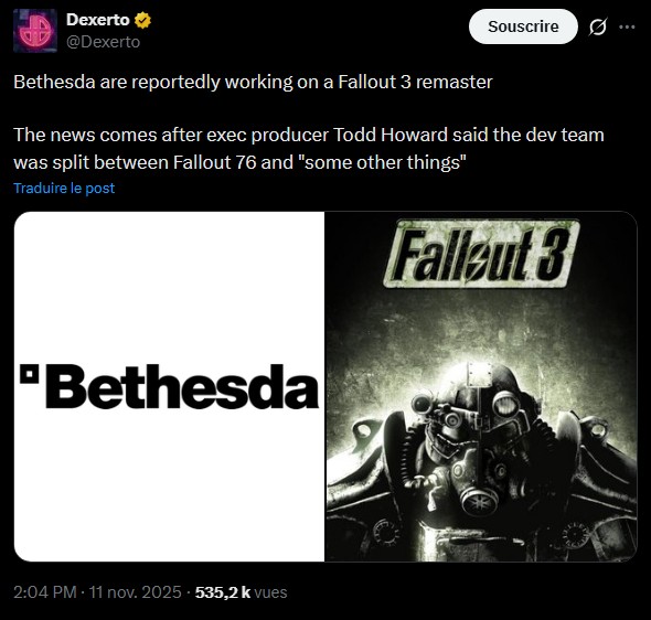 De son côté, Todd Howard, responsable de Bethesda, avait affirmé que les équipes du studio avaient été divisées afin de continuer à travailler sur Fallout 76, mais aussi sur d’autres projets. Ces déclarations pourraient donc impliquer un remaster de Fallout New Vegas, ainsi que de Fallout 3, comme le précise également l’article de GameRant.