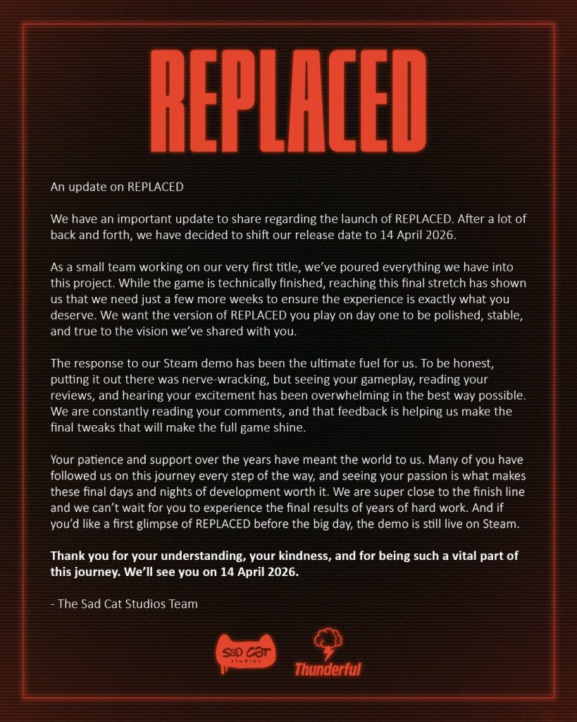 Mauvaise nouvelle pour les joueurs qui attendent Replaced. Le très attendu jeu cyberpunk en pixel art de Sad Cat Studios vient d’être une nouvelle fois repoussé. Initialement prévu pour mars 2026, le titre sortira finalement le 14 avril 2026.