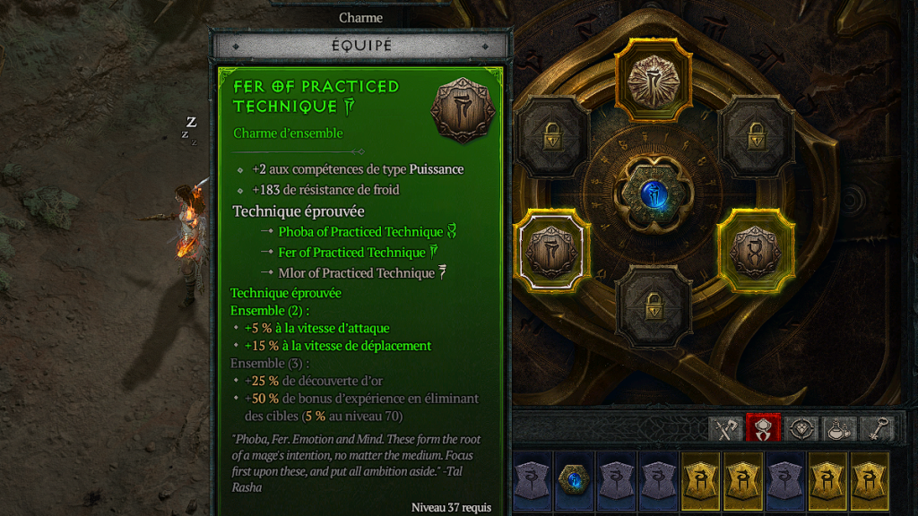 - Les Charmes d’Ensemble : Les plus puissants et rares des Charmes. Ce sont des ensembles de trois Charmes octroyant deux bonus par défaut, mais deux de plus pour chaque nouveau Charme du même ensemble que vous enchâssez dans votre Talisman de Lorath.