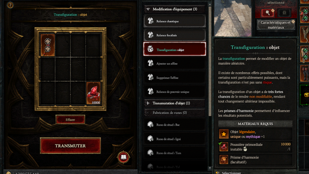 - Transmutation d’objet : Il est possible de transmuter trois objets afin de les combiner en un seul, recycler des objets Uniques afin d’en créer un nouveau, changer un objet Rare en objet Légendaire aléatoire, changer l’effet d’ensemble de vos ensembles de Charmes, créer un Charme Unique à partir d’un objet Unique, ou même combiner des objets identiques afin d’en créer une nouvelle version plus puissante.