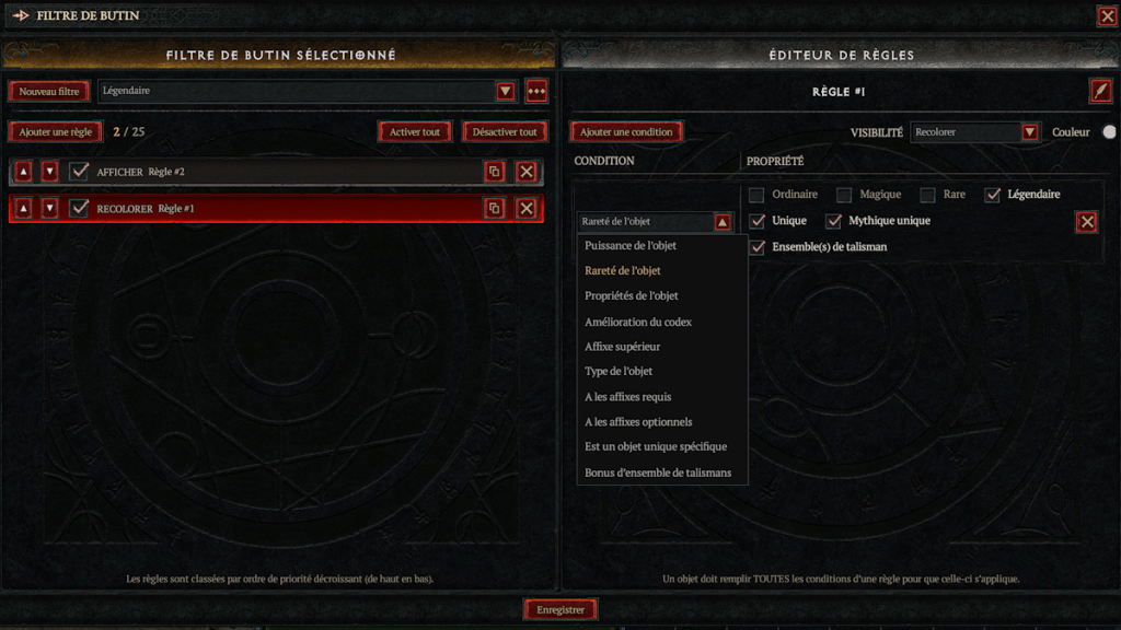 - Ajout du filtre de butin : Une nouvelle option disponible dans le menu des Options, catégorie « Jeu ». Elle permet de définir tout un tas de variables selon vos préférences pour l’affichage du butin de sorte à ne plus être parasité par les objets de faible qualité, ou bien même en changer la couleur d’affichage selon vos envies.
