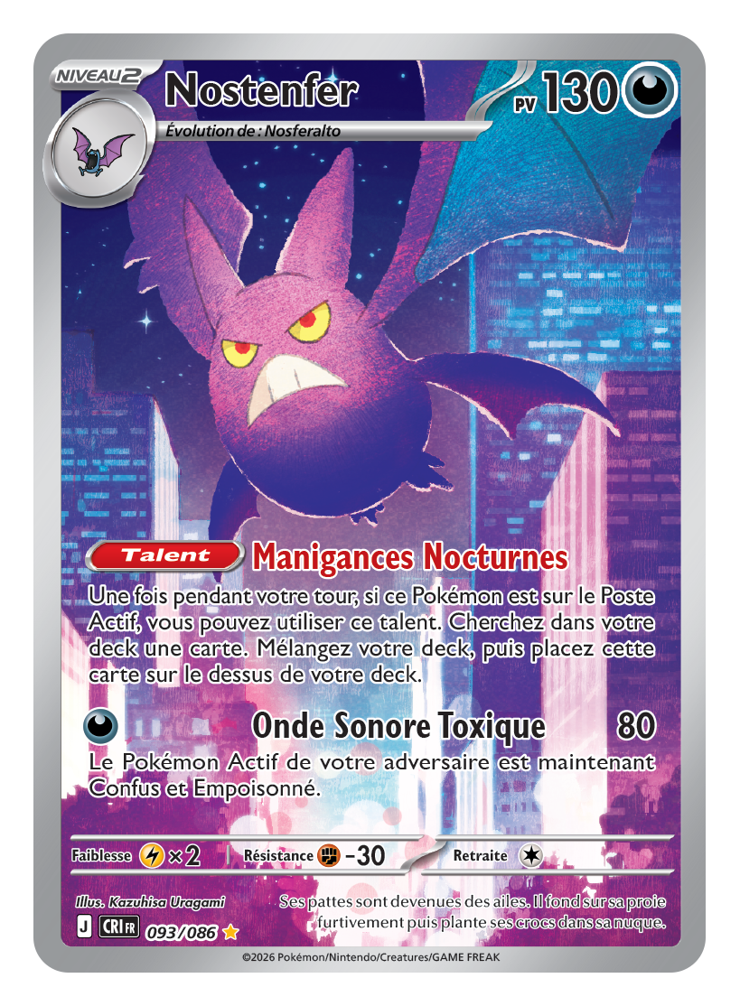 Dès le premier regard, cette carte de Nostenfer impose une ambiance très forte. On y retrouve le Pokémon chauve-souris survolant une ville illuminée de nuit, dans une direction artistique presque néon, qui colle parfaitement à son côté furtif et dangereux.