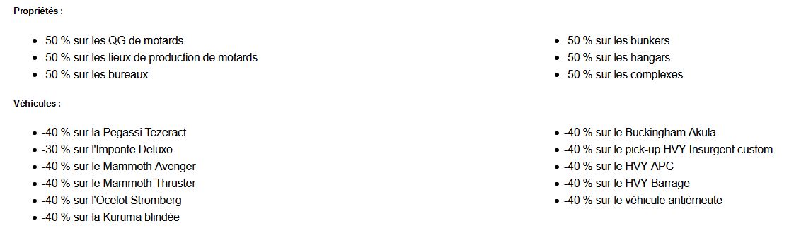 Tandis que le Diamond Casino offrira une prime aux joueurs, ces derniers pourront également bénéficier de promotions sur certains véhicules et bâtiments. Retrouvez ci-dessous la liste des éléments