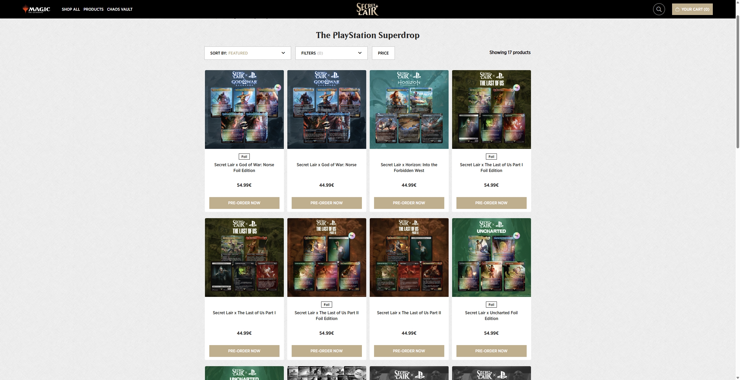 Le Superdrop inclut sept ensembles distincts, chacun dédié à une franchise PlayStation emblématique : The Last of Us Part I, The Last of Us Part II, God of War (Greek Saga), God of War (Norse Saga), Uncharted, Horizon: Forbidden West et Ghost of Tsushima. Chaque set contient des cartes inédites ou réinterprétées, illustrées dans le style de leur univers respectif. Ces cartes « new-to-Magic » introduisent parfois de nouvelles mécaniques ou personnages adaptés à l’univers PlayStation, un véritable croisement entre deux mondes cultes.