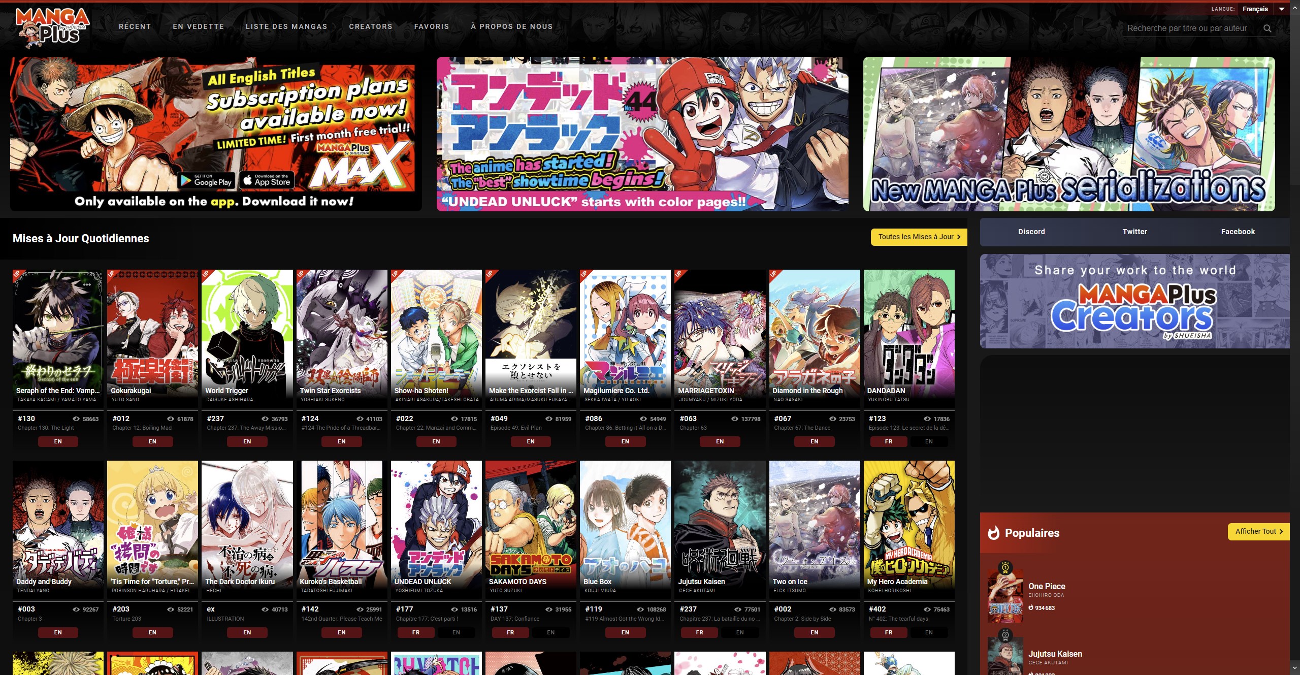 Manga Plus est la plateforme favorite des fans et contient des milliers de manga traduit en français et anglais.