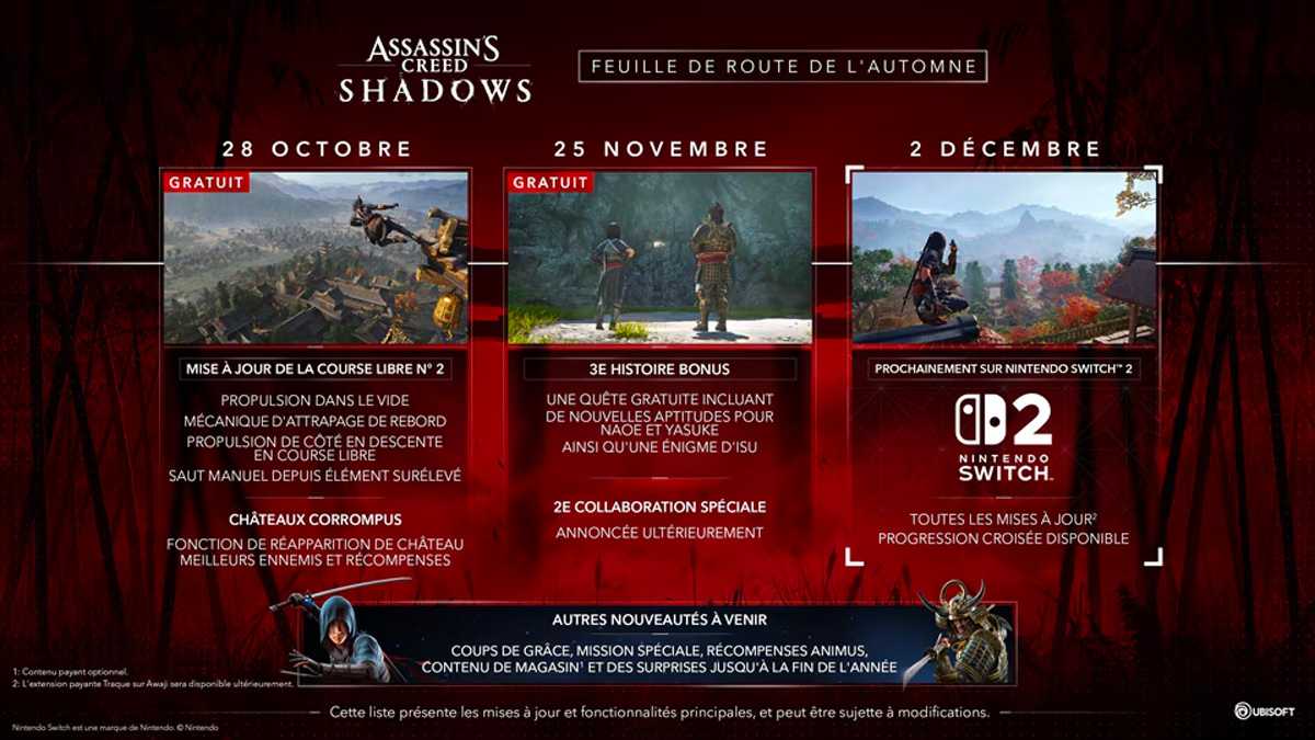 Vous l'aurez compris, les équipes sont bien décidées à nous gâter en cette fin d'année. En plus des nombreuses nouveautés citées précédemment, Assassin's Creed Shadows débarquera sur Nintendo Switch 2 le 2 décembre 2025 ! Cette version comportera toutes les dernières mises à jour et bonus gratuits, à l'exception du DLC Traque sur Awaji, prévu pour le début d'année prochaine.
