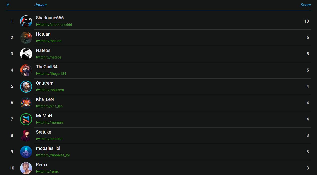 Shadoune666 a reçu 2 500 dollars, Hctuan en terminant troisième gagne 1 000 dollars et avec sa treizième place, NERU repart avec 1 500