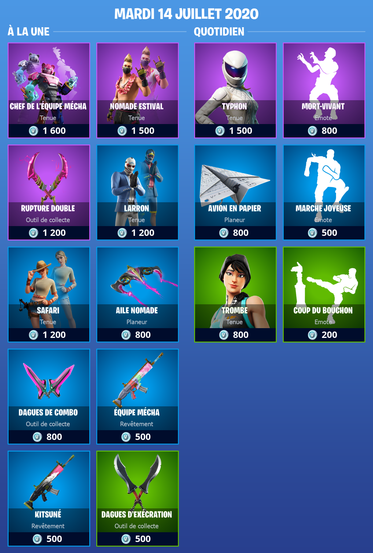 Fortnite, Boutique, Shop, Skins, Skin, Boutique du jour, Planeur, Danse, Emote, Infos, Photos.