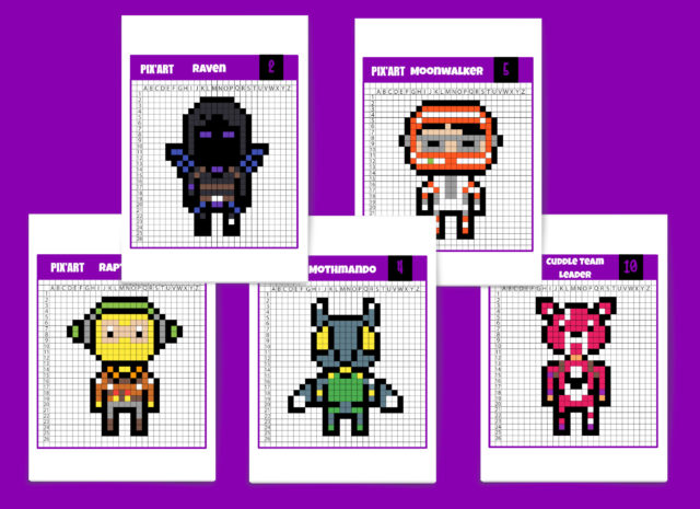 Des sites proposent des images d’éléments Fortnite en Pixel Art à imprimer, sur lesquelles il ne reste plus qu’à colorier ! Idéal pour occuper les plus