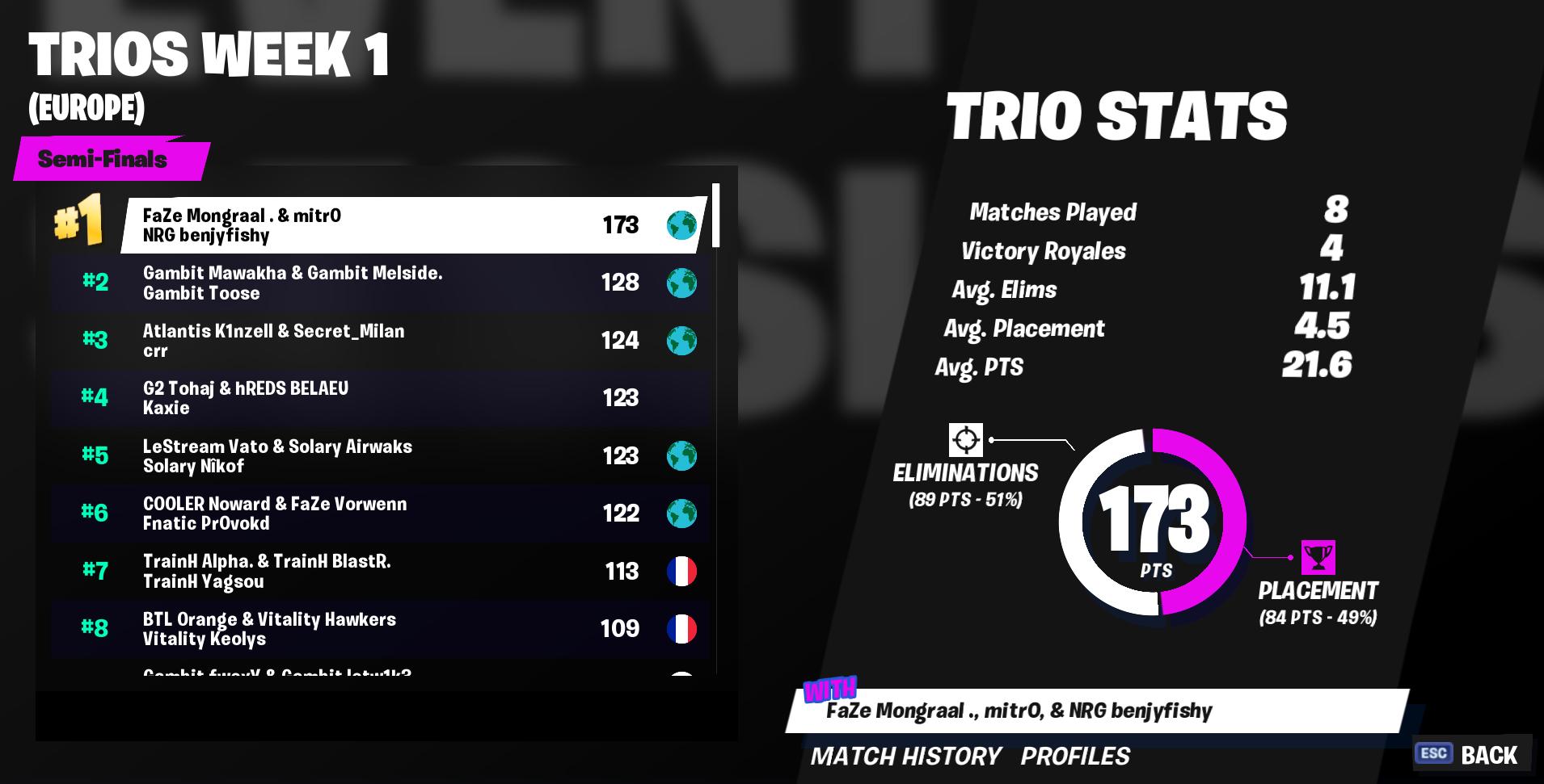 La première semaine de qualification pour les trios européens qui tenteront d’atteindre l’étape finale des Fortnite Champion Series se jouait ce week-end.