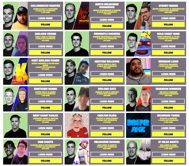 choisir l’un des 18 duos disponibles, ils représentent les 18 structures de football de la ligue australienne et sont incarnés par un influenceur et un joueur de l’équipe.