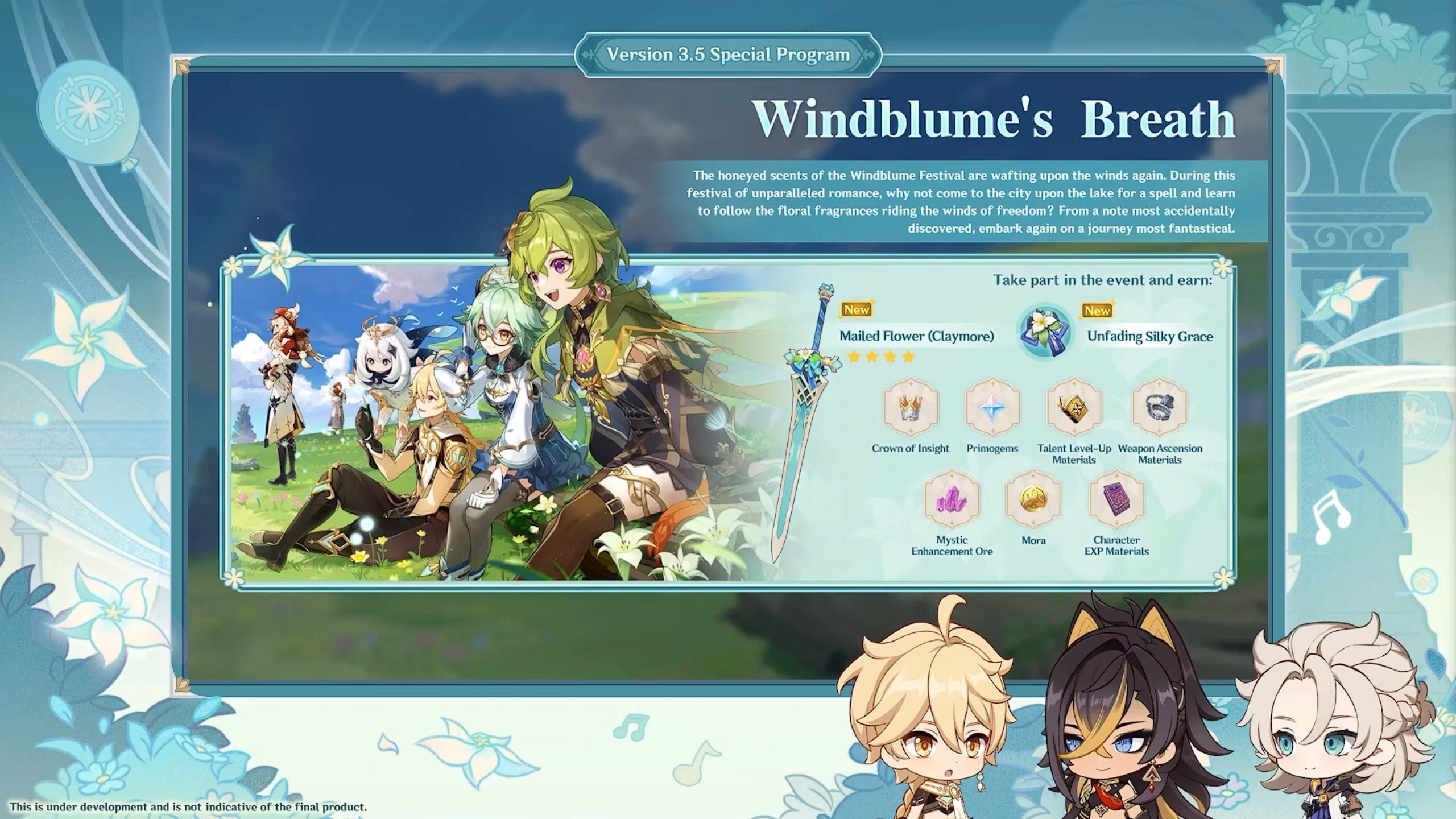 - Souffle des alizées (le Festival de Mondstadt) qui aura plusieurs mini-jeux dont un avec des ballons et un autre musical