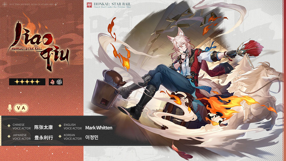 Jiaoqiu : Guérisseur et conseiller foxien, Jiaoqiu est un personnage de type feu suivant la Voie de la Nihilité. Il utilise des attaques qui appliquent le malus Charbons ardents,