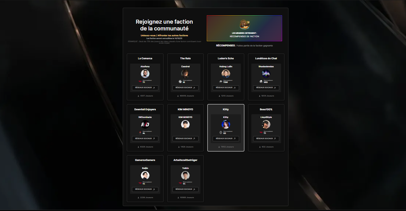 Du 7 octobre au 9 novembre, les Pick’ems sont de retour avec une interface revisitée et des rendez-vous à ne pas manquer. Mais attention, cette année les participants peuvent soutenir un créateur via la nouvelle fonctionnalité Factions communautaires : suivre les exploits de leur équipe préférée et cumuler des points en équipe, voilà qui ajoute du suspense et du fun à chaque tour du tournoi. Les dates clés à retenir :