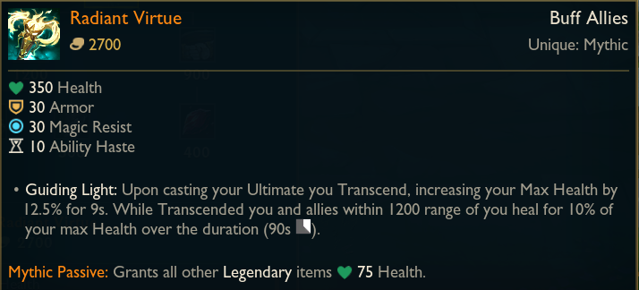 - Lumière directrice : Lancer votre ultime vous fait transcender, augmentant vos PV max de 12,5% pendant 9s. Pendant la transcendance, vous et vos alliés à moins de 1200