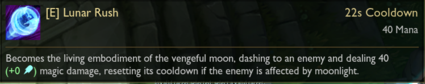 son ultime actuel, Rush lunaire, qui lui permet de dash sur un adversaire, avec son E, Attraction lunaire, qui attire les adversaires sur elle.