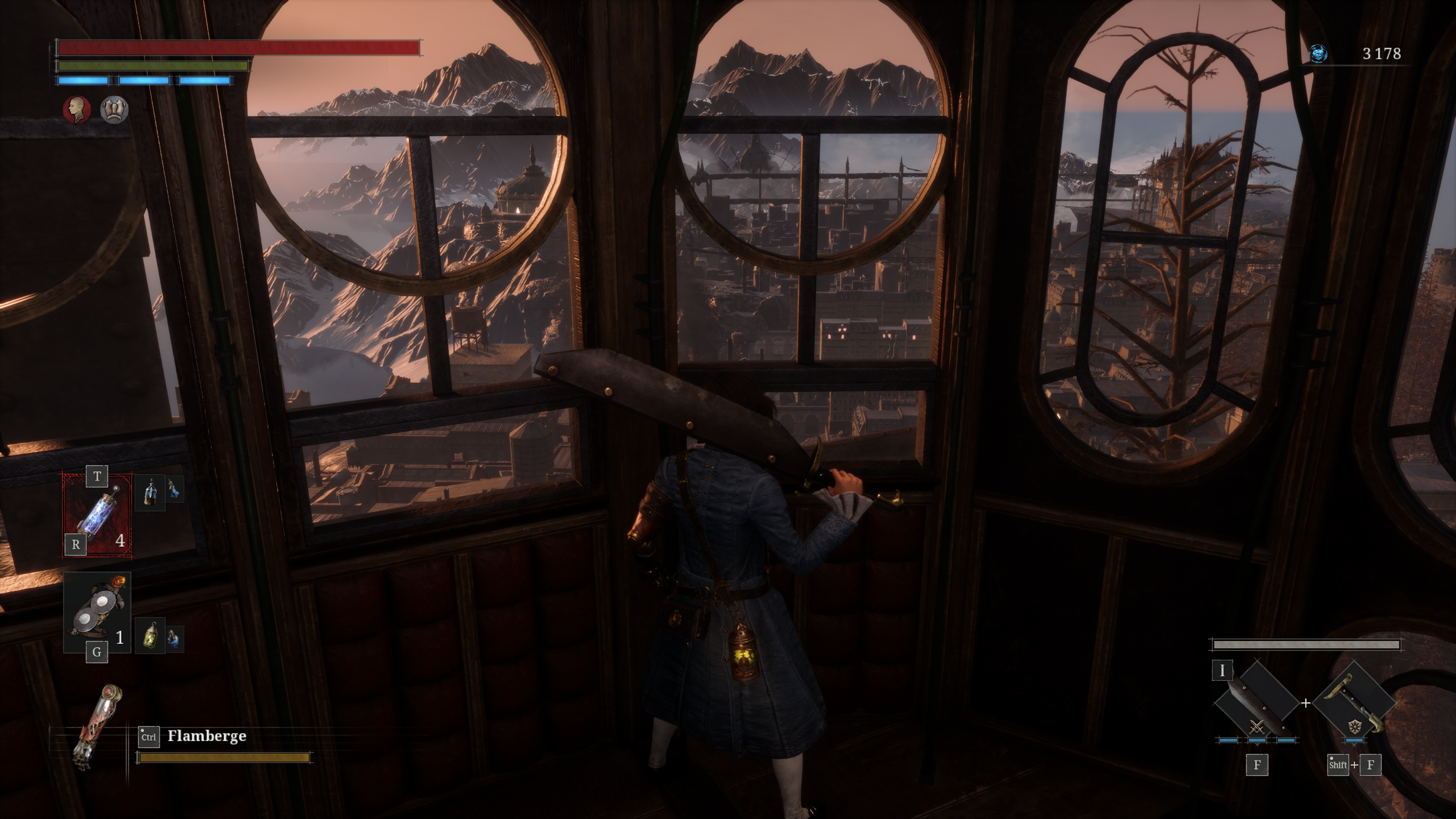 retrouve les aptitudes classiques : attaque légère, attaque lourde chargée, attaque dans le dos, esquive, parade, une barre d’endurance, des weapon arts, une fiole pour récupérer des points