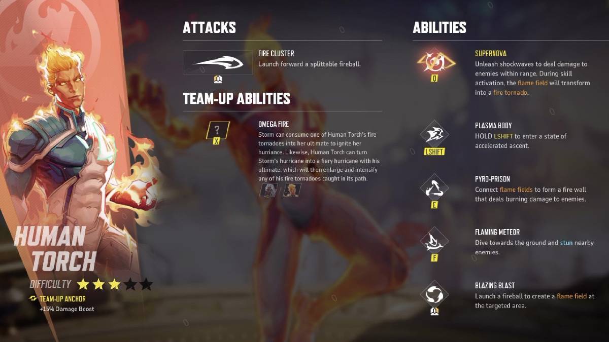 La Torche Humaine se distingue par ses attaques basées sur le feu et sa capacité à infliger des dégâts massifs tout en perturbant les ennemis. Voici un aperçu de ses compétences