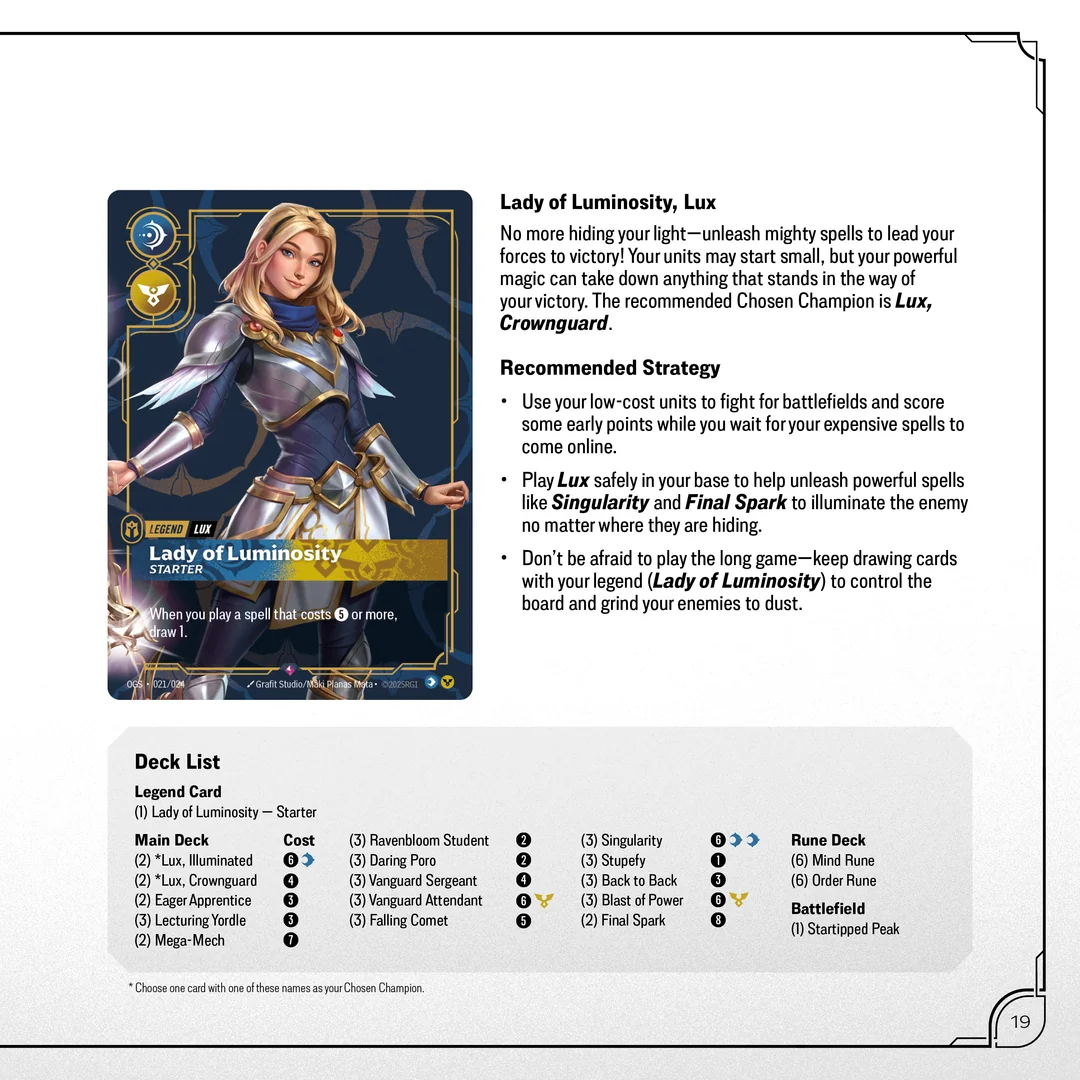 - Lux, la mage de la lumière, capable de dominer la partie avec ses sorts dévastateurs.