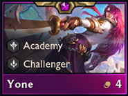 Yone, Étudiant / Challenger PV : 950 / AD : 80 / Vitesse d’attaque : 0,85 Sort : Yone invoque son esprit qui attaque un ennemi éloigné pendant 4 / 5 / 20 secondes. L’esprit est une copie inciblable et invulnérable de Yone, et le soigne |