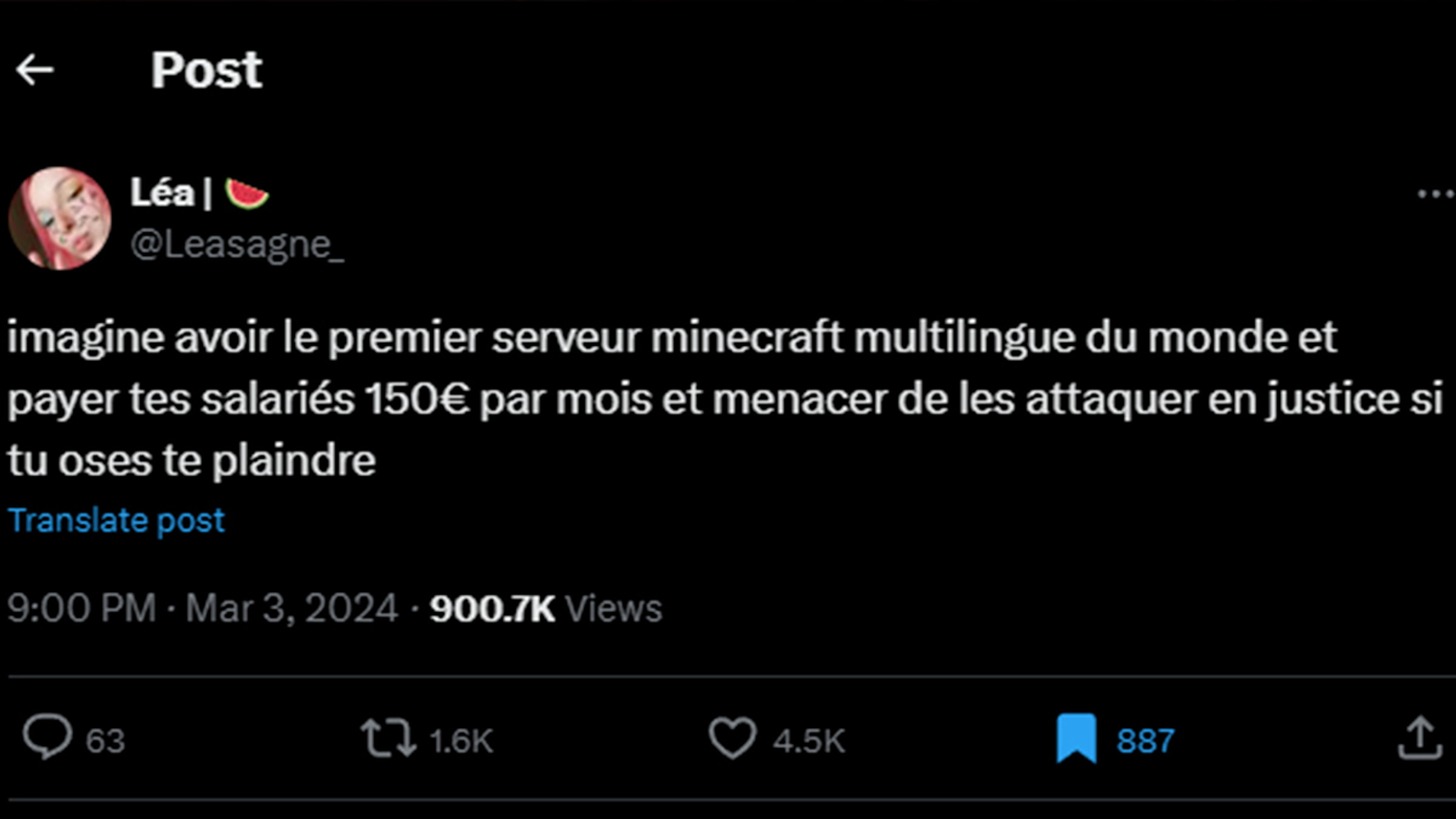 travaillait pour QSMP. Dans un tweet, elle dénonce la rémunération dérisoire et les menaces que vivent les employés du serveur Minecraft de Quackity.