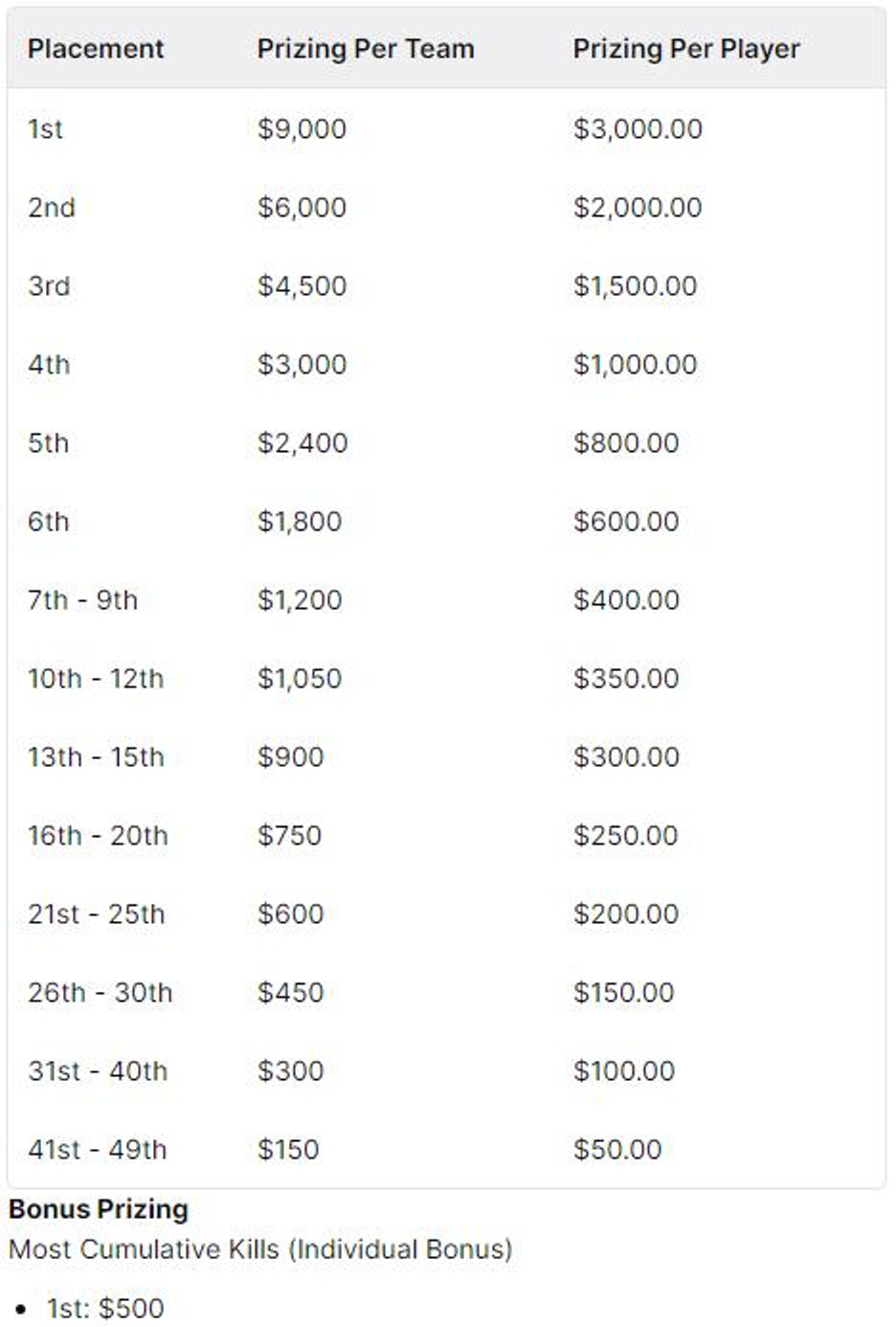 Comme dit précédemment, les participants se départageront les 49 500 dollars mis en jeu et le joueur ayant réalisé le plus d’élimination remportera 500 dollars.