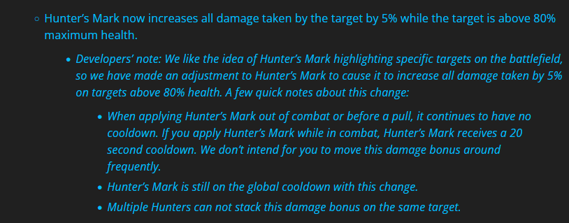 La Marque du Chasseur augmente désormais les dégâts subis par la cible de 5% tant qu’elle est au-dessus de 80% points de vie. L’idée des développeurs est de faire