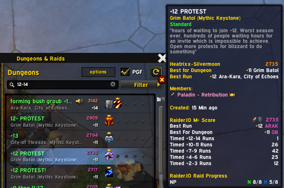 expriment leurs frustrations dans le canal de recherche de groupe (LFG), en nommant leurs groupes « PROTEST » pour attirer l’attention de Blizzard. Un joueur est même allé jusqu’à