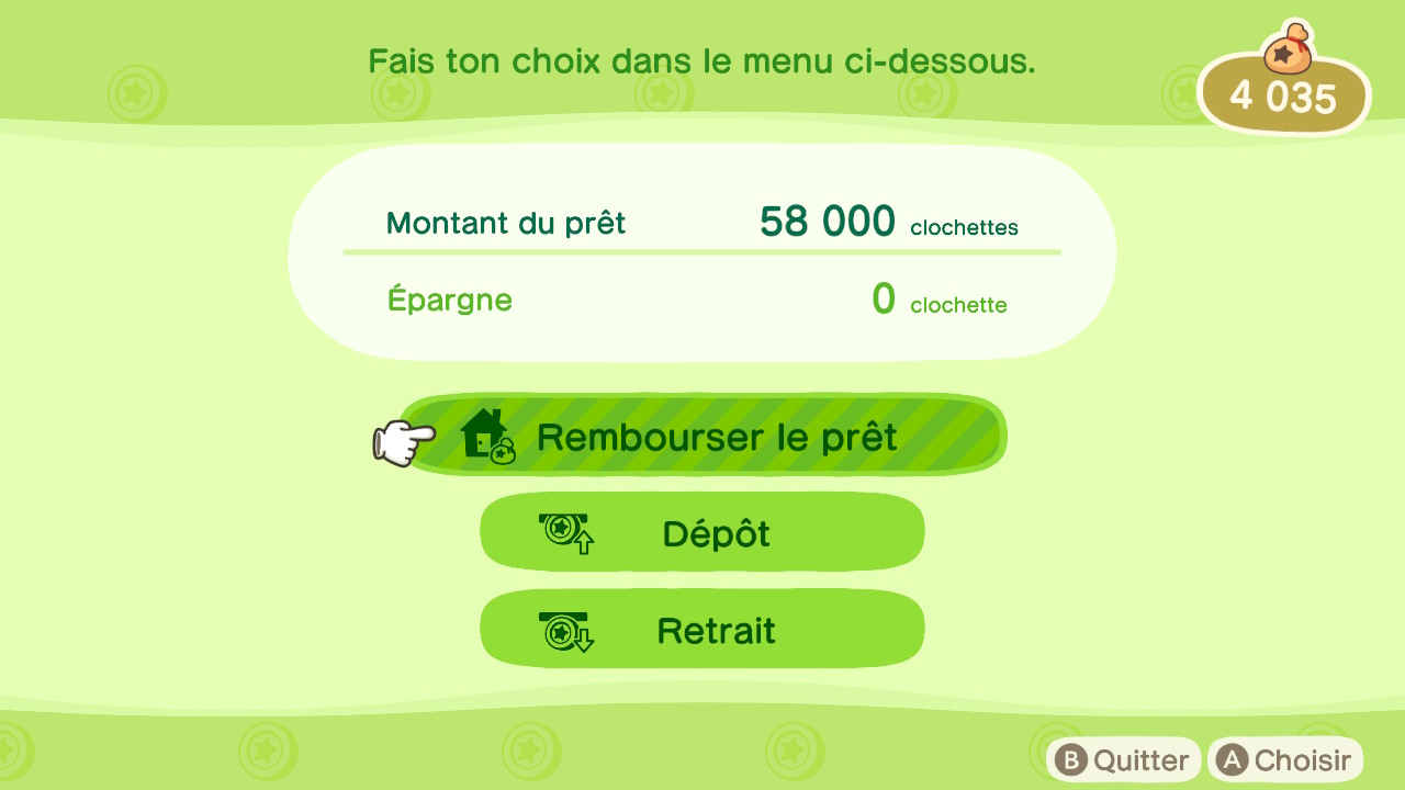 Mais pour pouvoir agrandir votre maison, il faut respecter une condition : rembourser les prêts à Tom Nook ! À chaque fois que vous rembourserez un emprunt, celui-ci vous