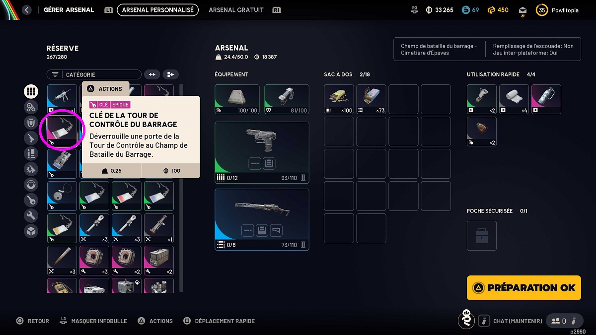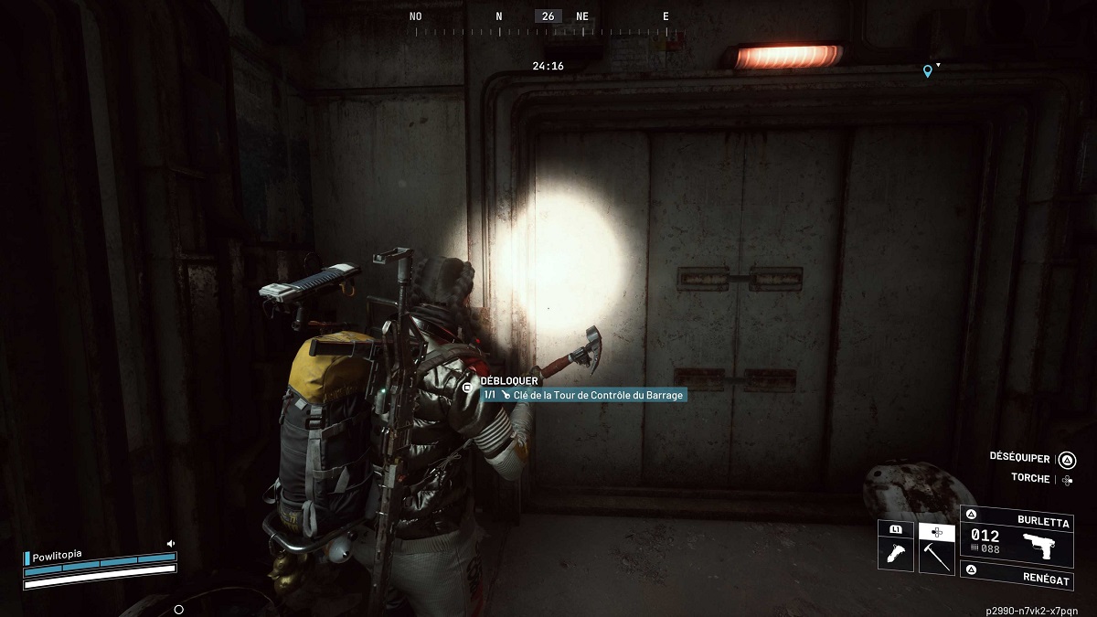 Maintenant que vous avez la clé en main, vous allez pouvoir partir découvrir la fameuse pièce qui se trouve, comme son nom l'indique, à la Tour de contrôle du Barrage. Mais toutefois, mieux vaut partir avec un arsenal personnalisé afin d'avoir la poche sécurisée pour pouvoir y mettre la clé de la tour (un ARC ou un autre Raider pourrait en effet vous mettre à terre avant que vous n'arriviez à destination).