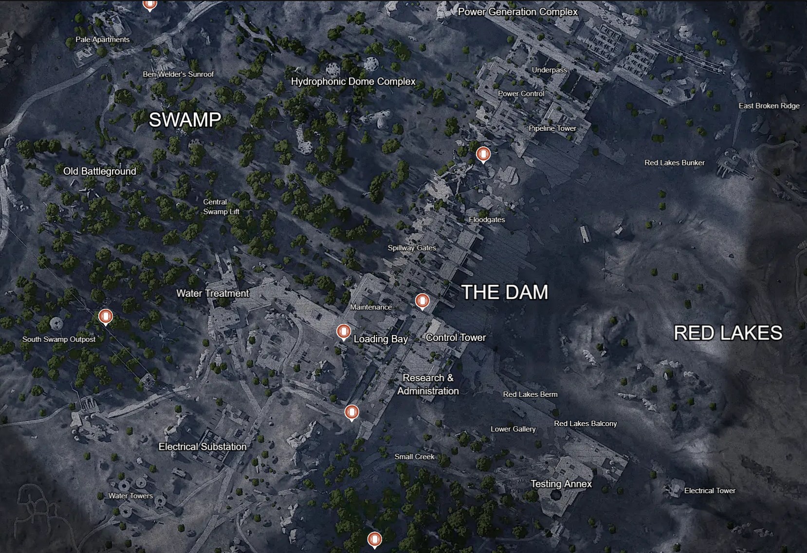 Emplacements des guetteurs au Barrage, ils sont représentés par les icônes orange - source image : Metaforge