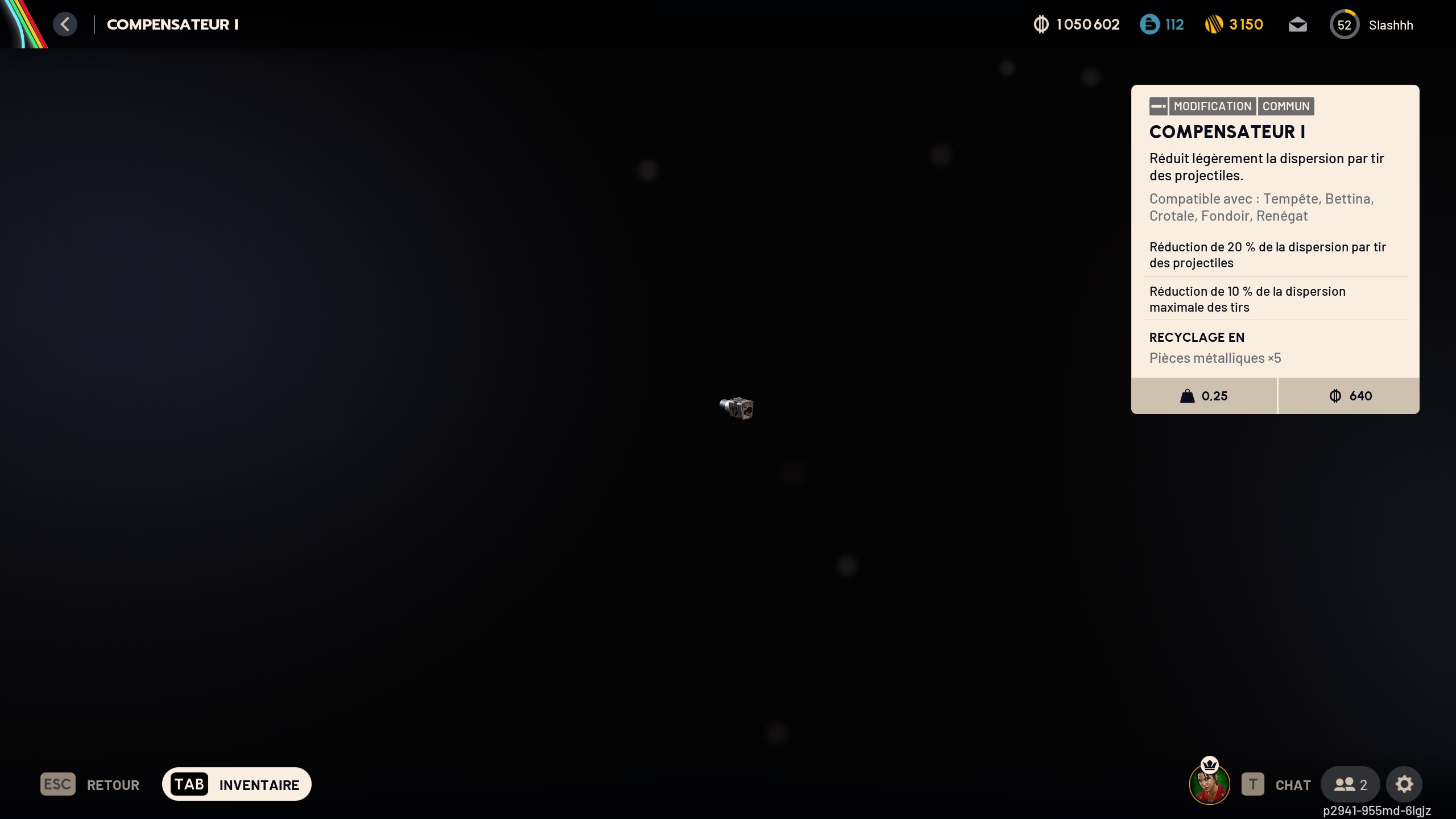 | Convertisseur cinétique | À venir | Ferro, Fondoir, Crotale, Sutureur, Arpège, Il Toro, Venator, Bettina, Lynx, Tempête, Vulcano et Brise-fuselage | + 15 % cadence de tir + 20 recul horizontal et vertical |