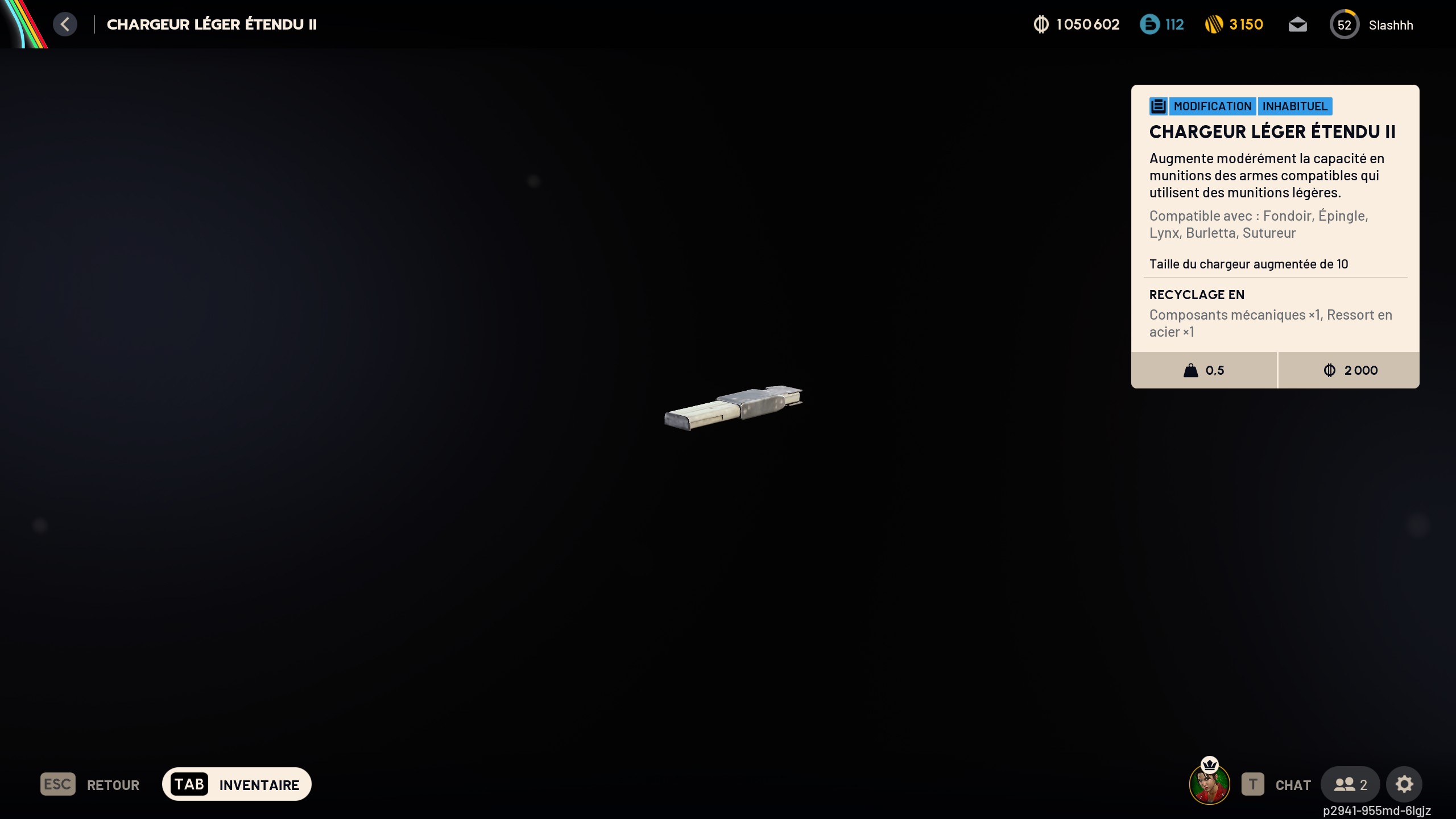 | Chargeur léger étendu III | 2 x Composants de mods 5 x Ressort en acier |