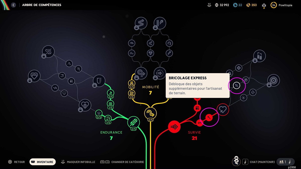 Mais ce n'est pas terminé ! À ce stade, le piège à grenade incendiaire n'est toujours pas disponible, et pour cela, vous allez devoir débloquer une autre compétence : « Bricolage express ». Grâce à celle-ci, de nouveaux objets seront disponibles à la fabrication in-game, dont ce fameux piège !