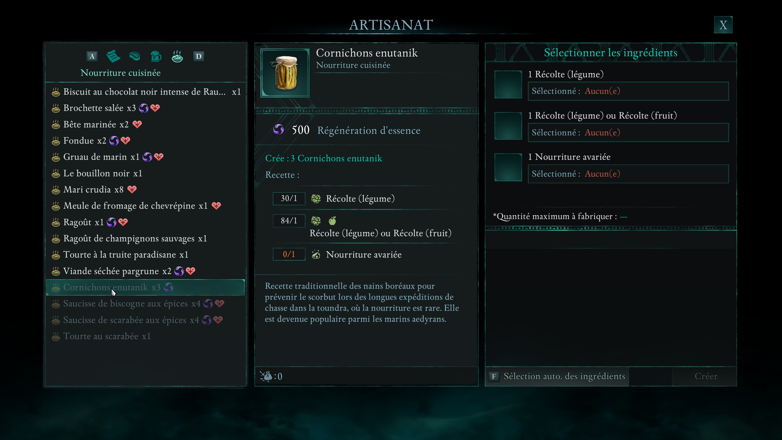 | Saucisse de biscogne aux épices | Rôti ou Longe de biscogne en salaison | Viande cuite ou crue | Nourriture avariée | Régénère 50 points d’essence et 50 points de santé |