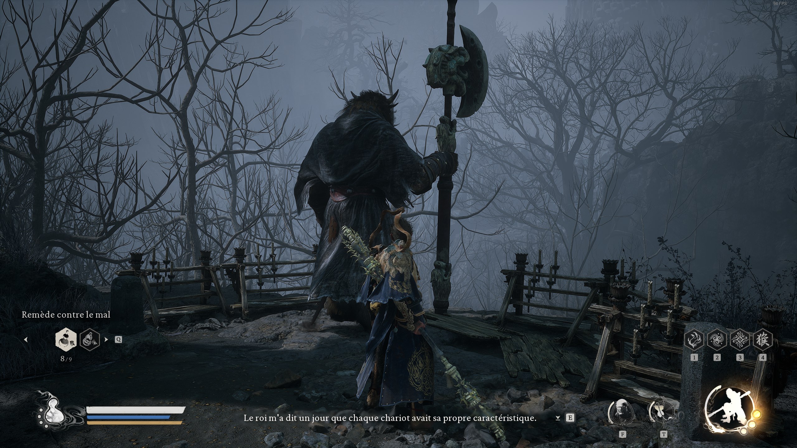 Maintenant que vous avez éliminé les 4 chariots, retournez voir Hache pâle robuste et parlez-lui jusqu’à ce que finisse par répéter la même phrase en continu. Dès que c’est le