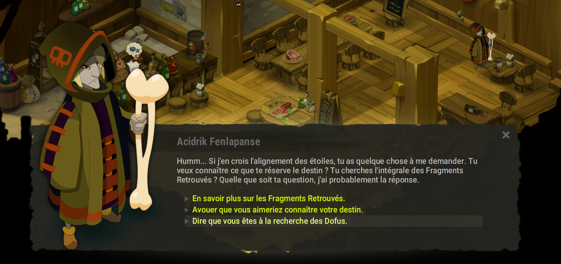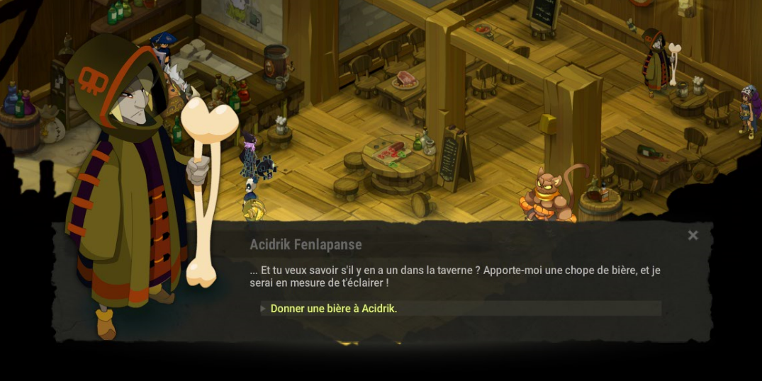 Rendez-vous à la taverne en [6,-18] et parlez à Acidrik Fenlapanse : « Dire que vous cherchez les Dofus ».