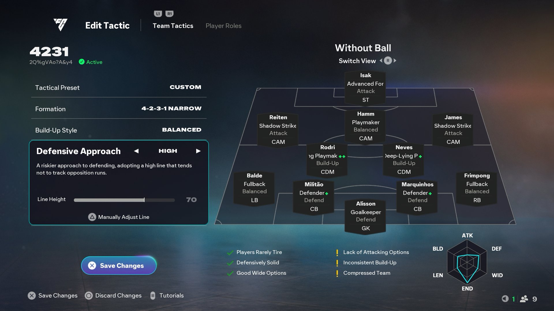 Simple, lisible, efficace. Le 4-3-3 reste une valeur sûre, surtout avec la méta actuelle qui récompense les ailes bien exploitées. Que ce soit en version avec un milieu offensif ou avec un milieu à 3 centraux, cette formation offre une grande adaptabilité.