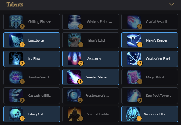Pour optimiser ses performances, certains talents sont incontournables. Winter’s Embrace (Etreinte de l'Hiver) renforce de 20 % les dégâts pendant Bursting Ice (Glace Explosive), l’un de ses sorts phares. Icy Flow (Flot Glacé) accélère les canalisations, rendant la rotation plus fluide. Voici de manière général les talents que vous devrez prendre :