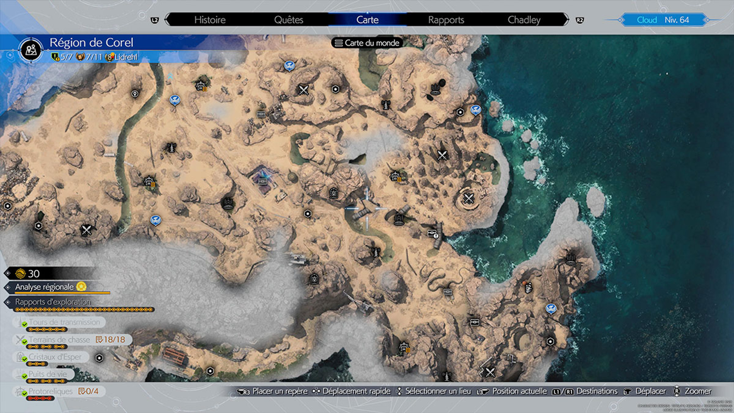 Au total, vous avez 8 arrêts chocobo à trouver dans la région de Corel sur FF7 Rebirth. Pour vous aider à les trouver facilement, voici deux captures d’écran de la région de Corel avec tous les