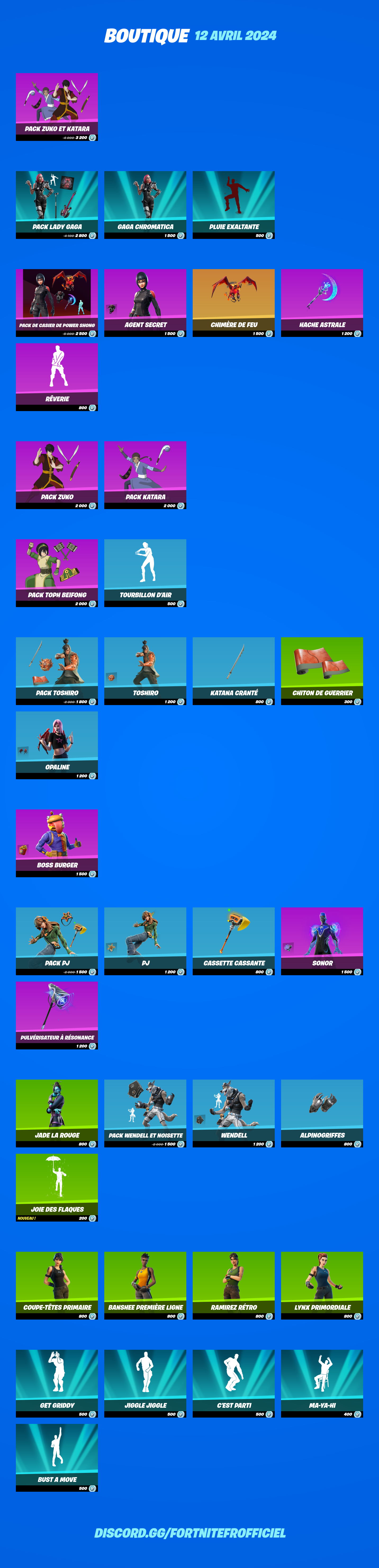 Voici la liste des skins disponible dans la boutique Fortnite du 12 avril 2024.