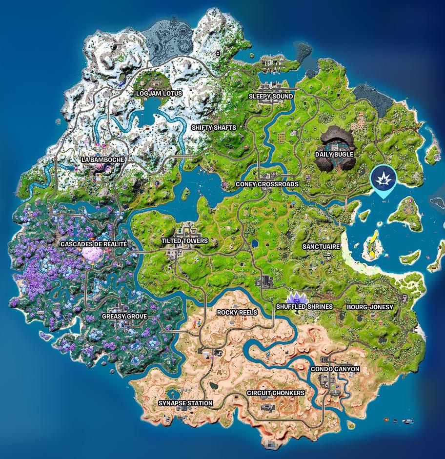 Les canots motorisés et les grandes bouées se trouvent à l’emplacement des bulles bleues (crédits : Fortnite)
