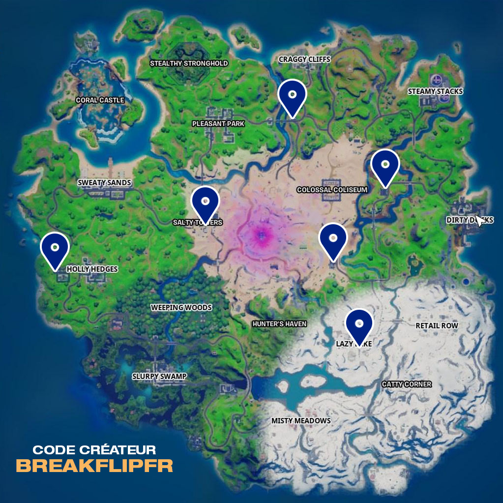 Vous pouvez vous aider de la map ci-dessous pour trouver l’emplacement des différentes stations essence sur Fortnite :