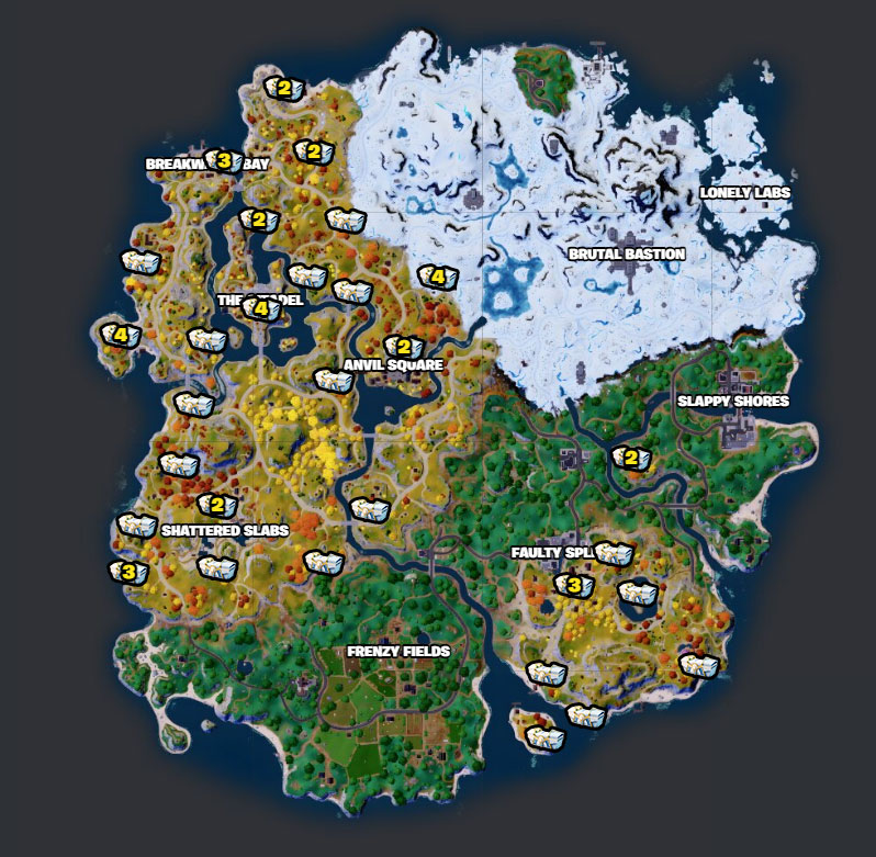 certaines zones de la carte. Leur emplacement est fixe et pour vous aider, vous pouvez utiliser la carte ci-dessous que nous avons obtenue grâce à la carte interactive de Fortnite.GG.