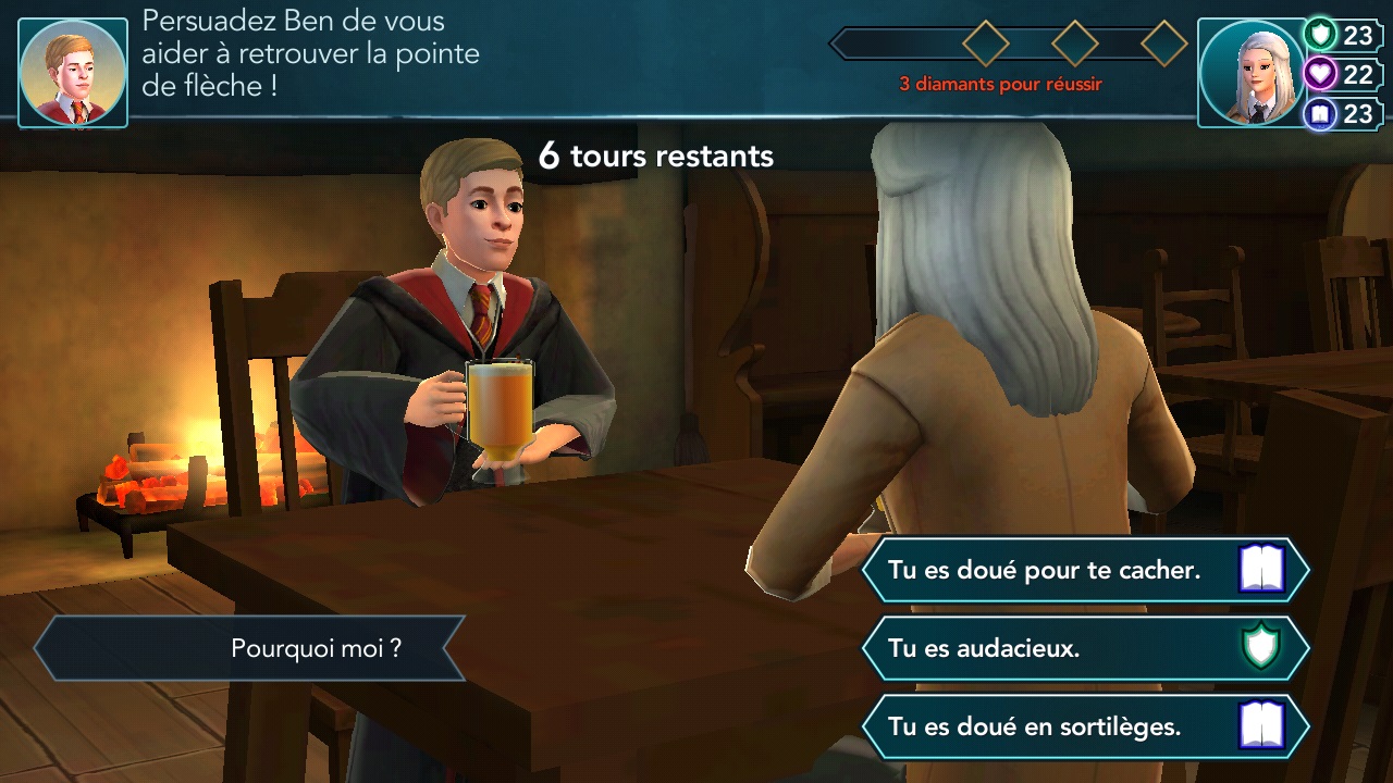 Vous vous trouvez dans le pub des Trois Balais en compagnie de votre ami Ben, qui vous demande de le persuader de vous aider à retrouver la pointe de flèche cachée dans l’antre du Chaporouge.