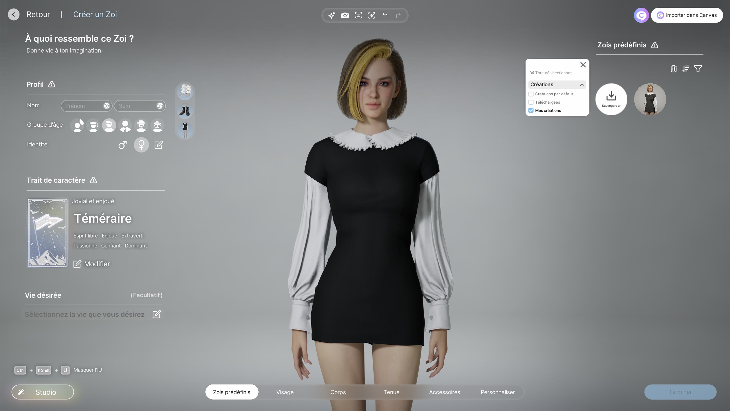 Lorsque vous avez créé votre personnage sur la démo, vous avez normalement dû vous créer un compte pour la fonctionnalité Canvas. Après que votre ZOI a été finalisé, vous avez pu
