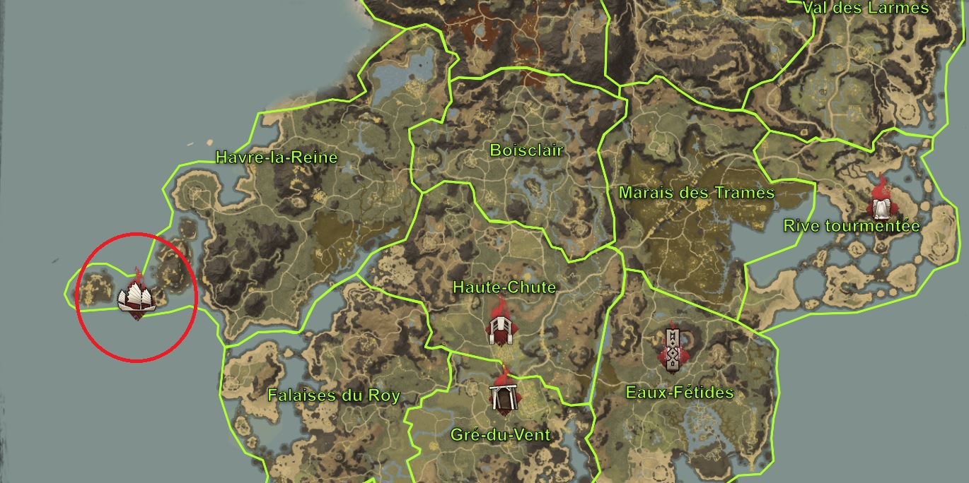 L’entrée du donjon du Chantier naval de la dynastie se trouve à l’ouest de Havre-la-Reine. Retrouvez ci-dessous la carte permettant d’y accéder.