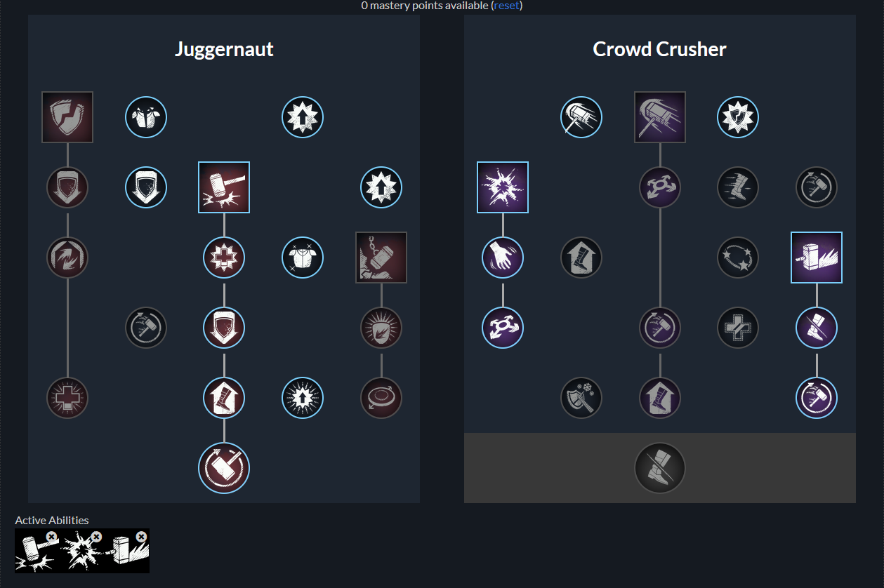 situations en PvP. Si vous pensez manquer de mobilité, abandonnez les deux points de l’arbre Juggernaut pour prendre les deux restants dans l’autre arbre.